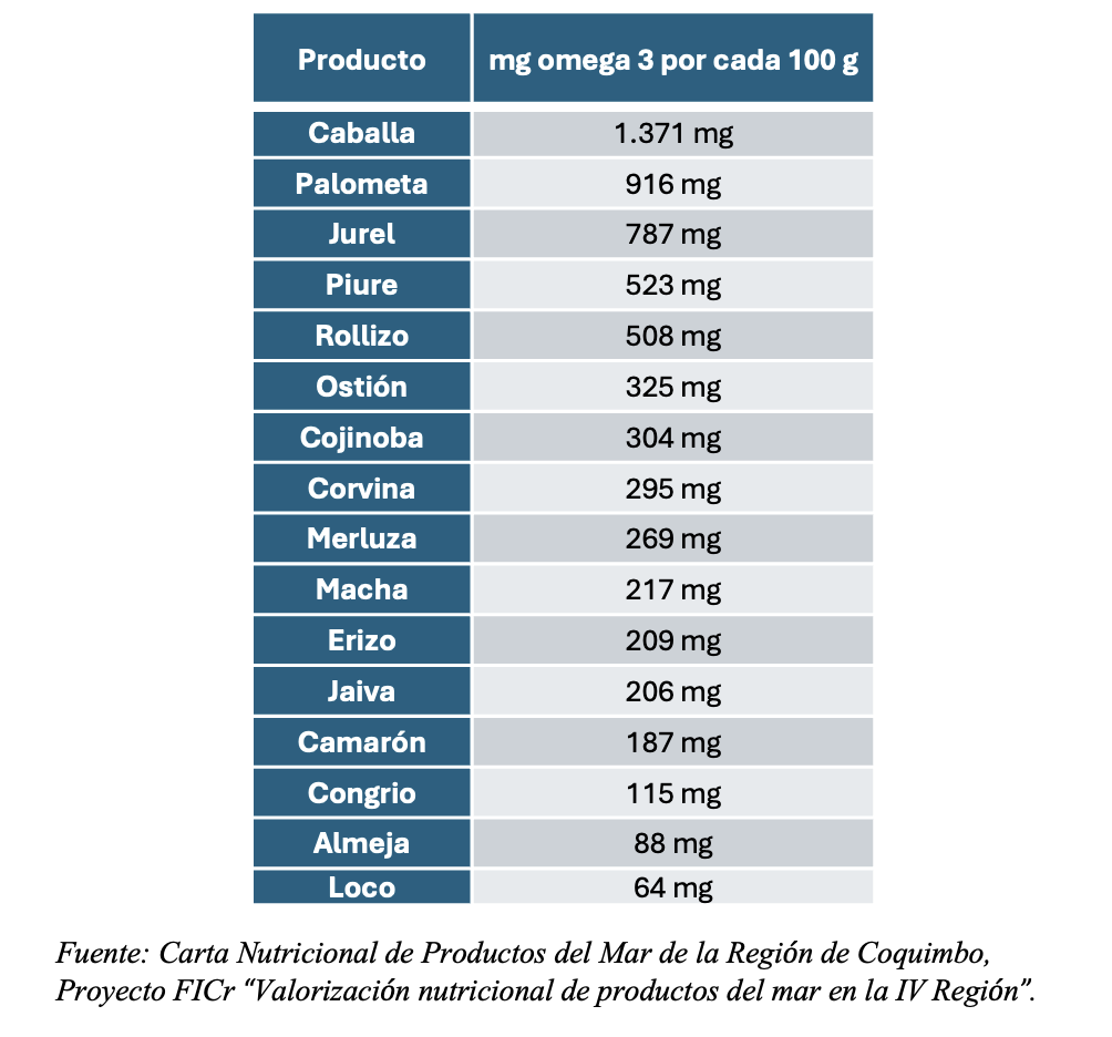 Los requerimientos diarios recomendados de estos ácidos grasos bordean los 250-500 mg/día según organizaciones internacionales como la Organización de las Naciones Unidas para la Alimentación y la Agricultura (FAO) y la Organización Mundial de la Salud (OMS). Los ácidos grasos poliinsaturados de cadena larga son un tipo de grasa dietaria saludable, beneficiosa para la salud. En ese contexto, estudios realizados en INTA sobre la composición de ácidos grasos en especies comestibles del Pacífico Sur evidenció que varias especies locales son fuentes importantes de estos omega 3 de cadena larga. Esta investigación se realizó en el contexto del proyecto FICr “Valorización nutricional de productos del mar en la IV Región”, financiado por el Gobierno Regional de Coquimbo y realizado por investigadores del INTA Uchile y la Universidad Católica del Norte.