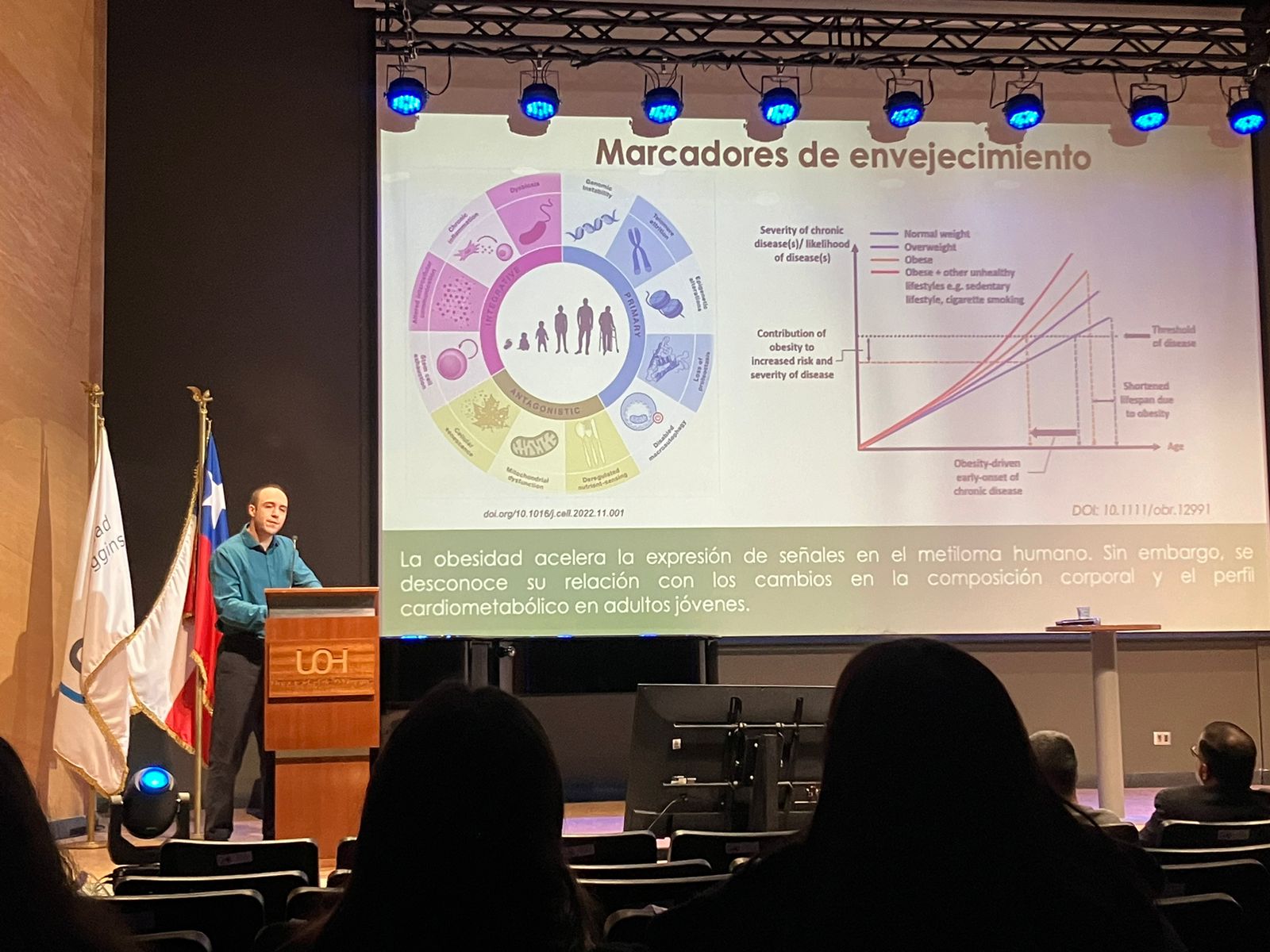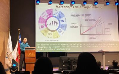 - La obesidad ha sido postulada como un factor que acelera el envejecimiento. Se sugiere que la obesidad acelera el envejecimiento alterando hallmarks como la senescencia celular, disfunción mitocondrial, inflamación, cambios en el epigenoma y longitud de los telómeros. Sin embargo, qué factores de la composición corporal y de riesgo cardiometabólicos podrían explicar este envejecimiento prematuro no está estudiado. En base a una cohorte de nacimiento chilena se buscó determinar qué variables históricas de antropometría, composición corporal y cardio metabólicas explican la diferencia entre edad cronológica y epigenética, así como la longitud de telómeros. Se sugiere que la exposición a la obesidad persistente durante infancia o adolescencia se asocia con un envejecimiento acelerado. De manera similar, mayor edad biológica parece estar asociada con mayor riesgo cardio metabólico en adultos jóvenes.