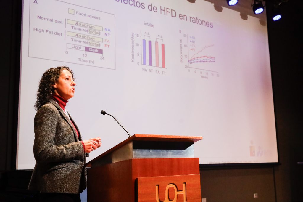 - Los ritmos circadianos son procesos fisiológicos con ciclos de aproximadamente 24h, que se sincronizan principalmente con la luz y regulan funciones como sueño, alimentación y metabolismo. El cronotipo representa la predisposición a mayor actividad en determinados momentos del día; y aquellos con cronotipos muy tardíos o tempranos se les conoce habitualmente como “búhos” y “alondras”, respectivamente. Por su parte, los cronotipos tardíos se han asociado con mayor riesgo de enfermedades crónicas En este contexto, resulta interesante establecer un modelo de cronotipos para estudiar los mecanismos asociados al impacto en la salud metabólica. El objetivo de este trabajo es establecer un modelo simple de Cronotipos, para poder estudiar in vivo los mecanismos que puedan explicar la respuesta metabólica diferencial de búhos y alondras.
